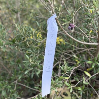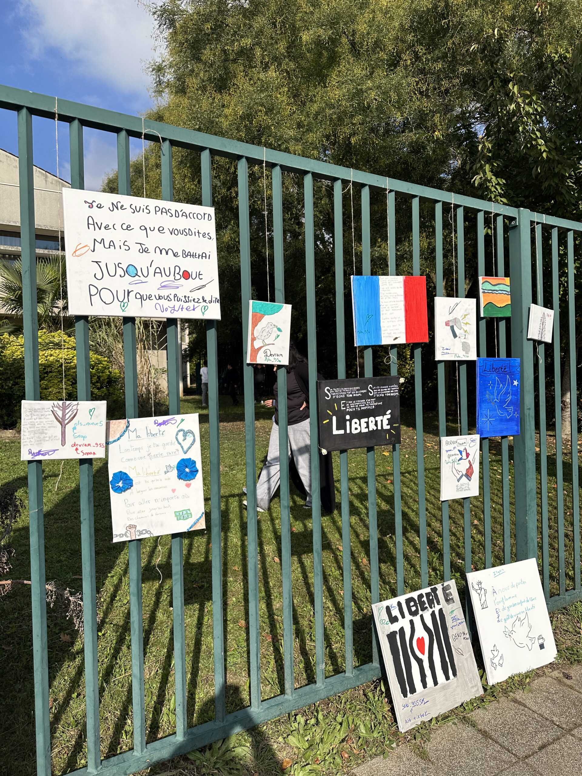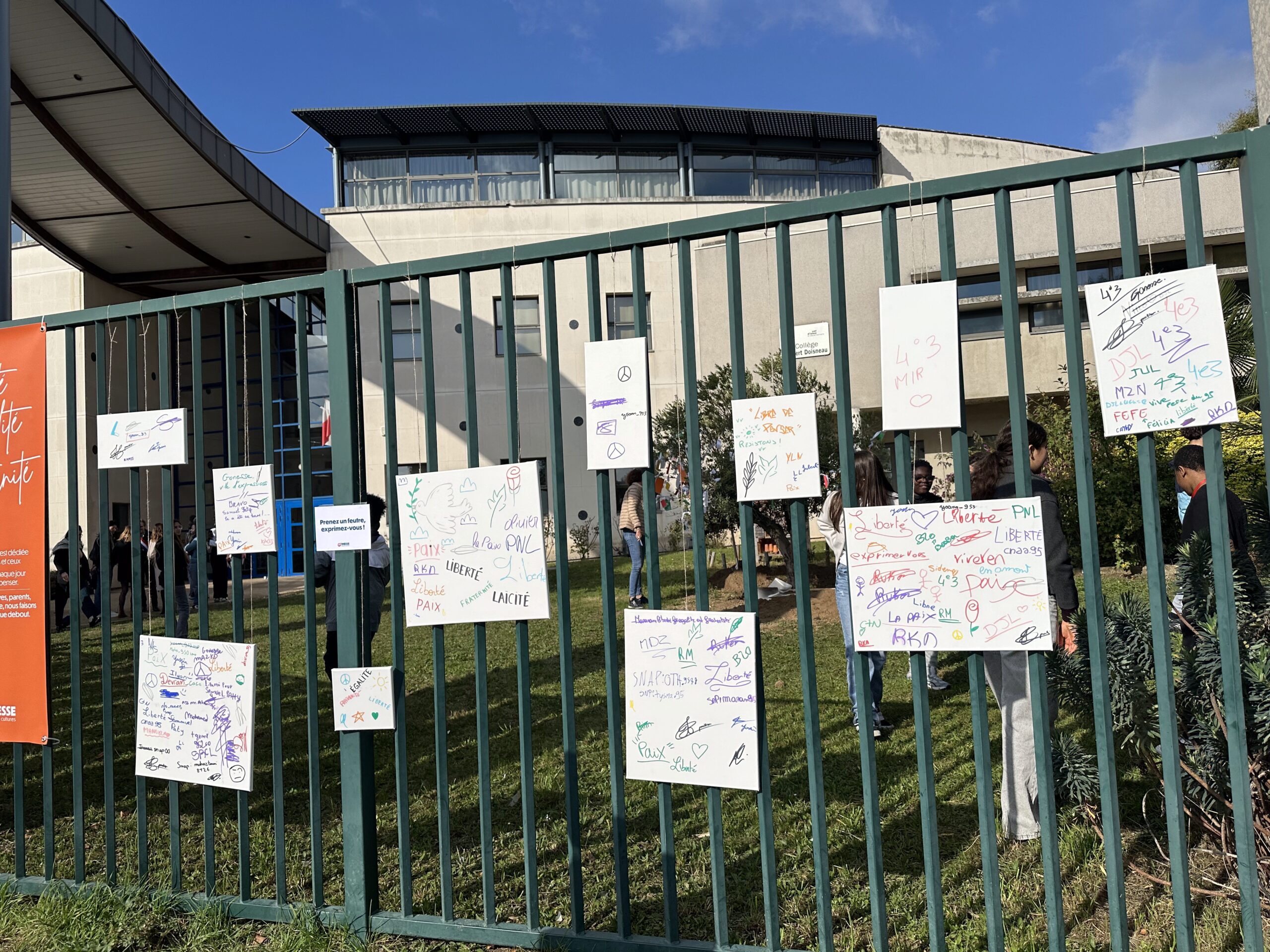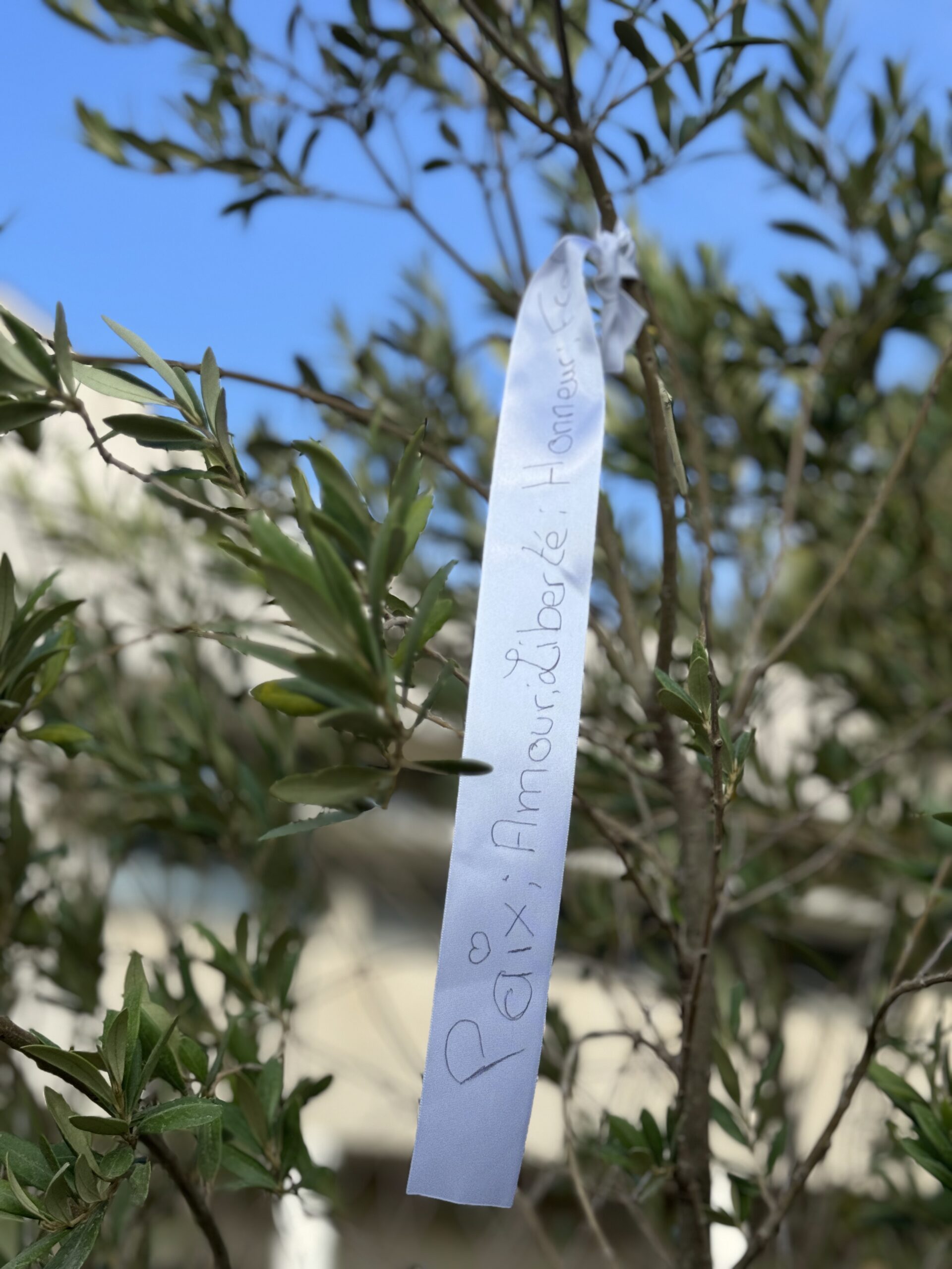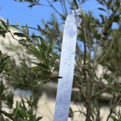 Des ateliers d’expression ont également été proposés aux collégiens : ils ont pu dessiner et écrire des messages de paix et de fraternité sur des toiles, exprimant leurs émotions et leur attachement aux valeurs républicaines. Lors du dépôt des rubans sur l’olivier, Mickaëlle Paty a elle-même noué un ruban porteur d’un message de reconnaissance envers la ville de Gonesse et d’amour pour son frère, dans un geste à la fois intime et profondément symbolique.